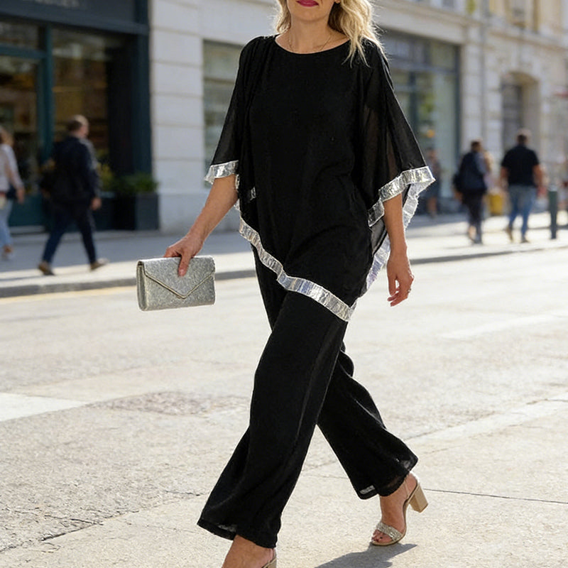 🎁Free Gift 🎁 Elegant Sequin Trim Poncho Top & Wide-Leg Pants Set