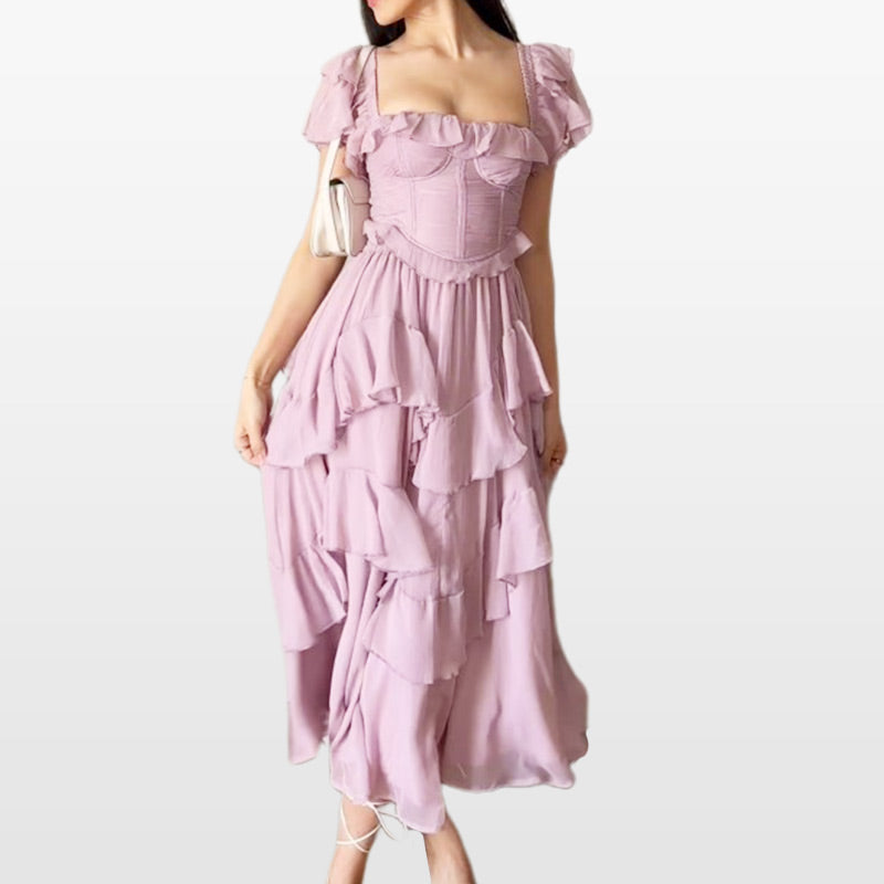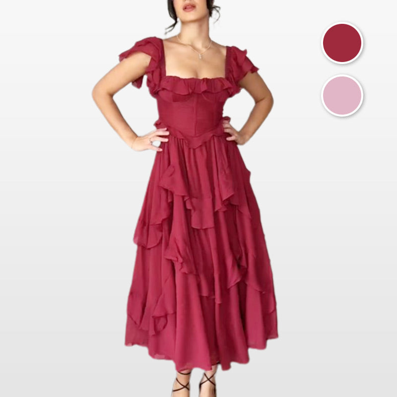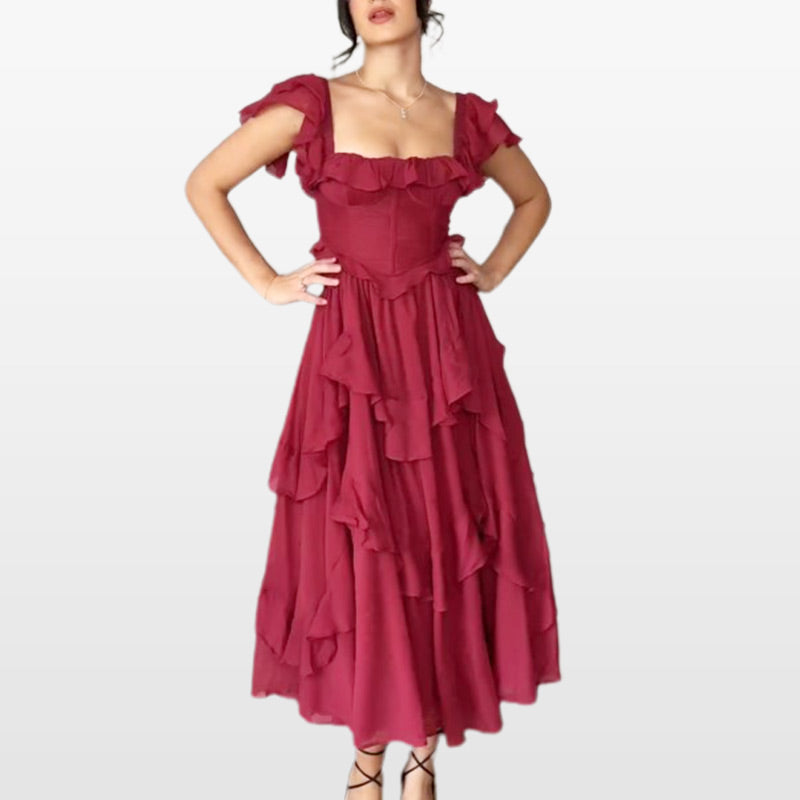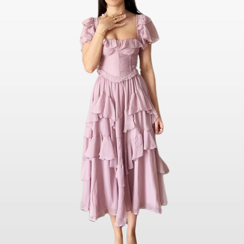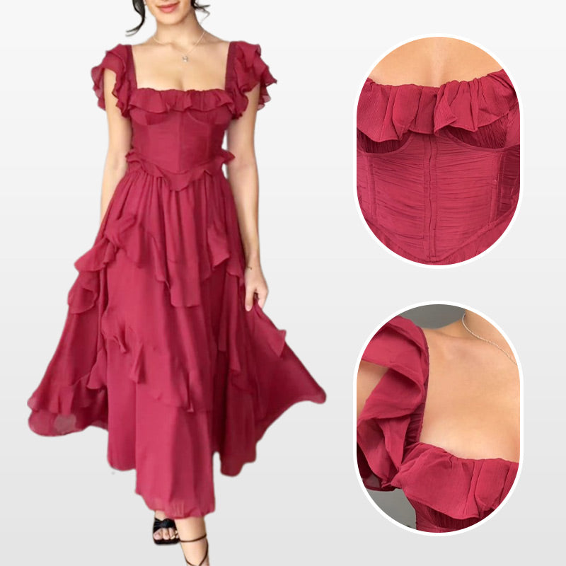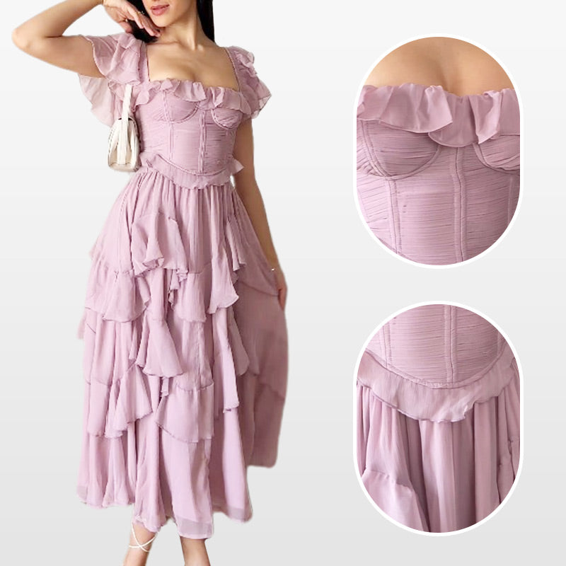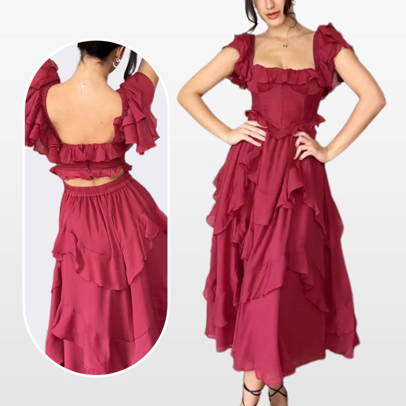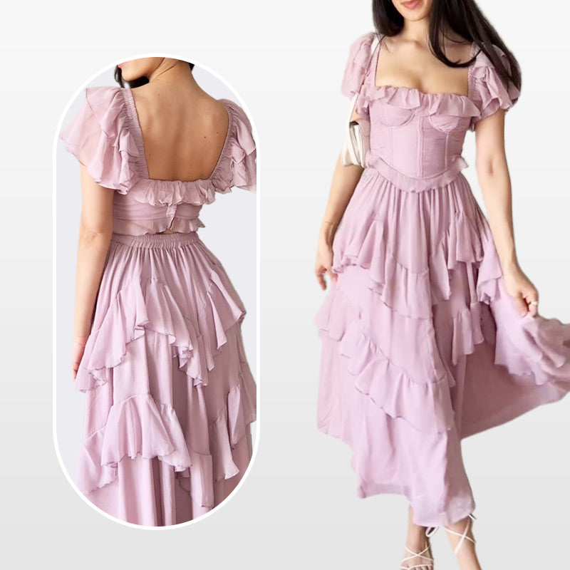 RUFFLED TIERS: Elegant, layered ruffles that create a flowing silhouette, adding volume and movement.